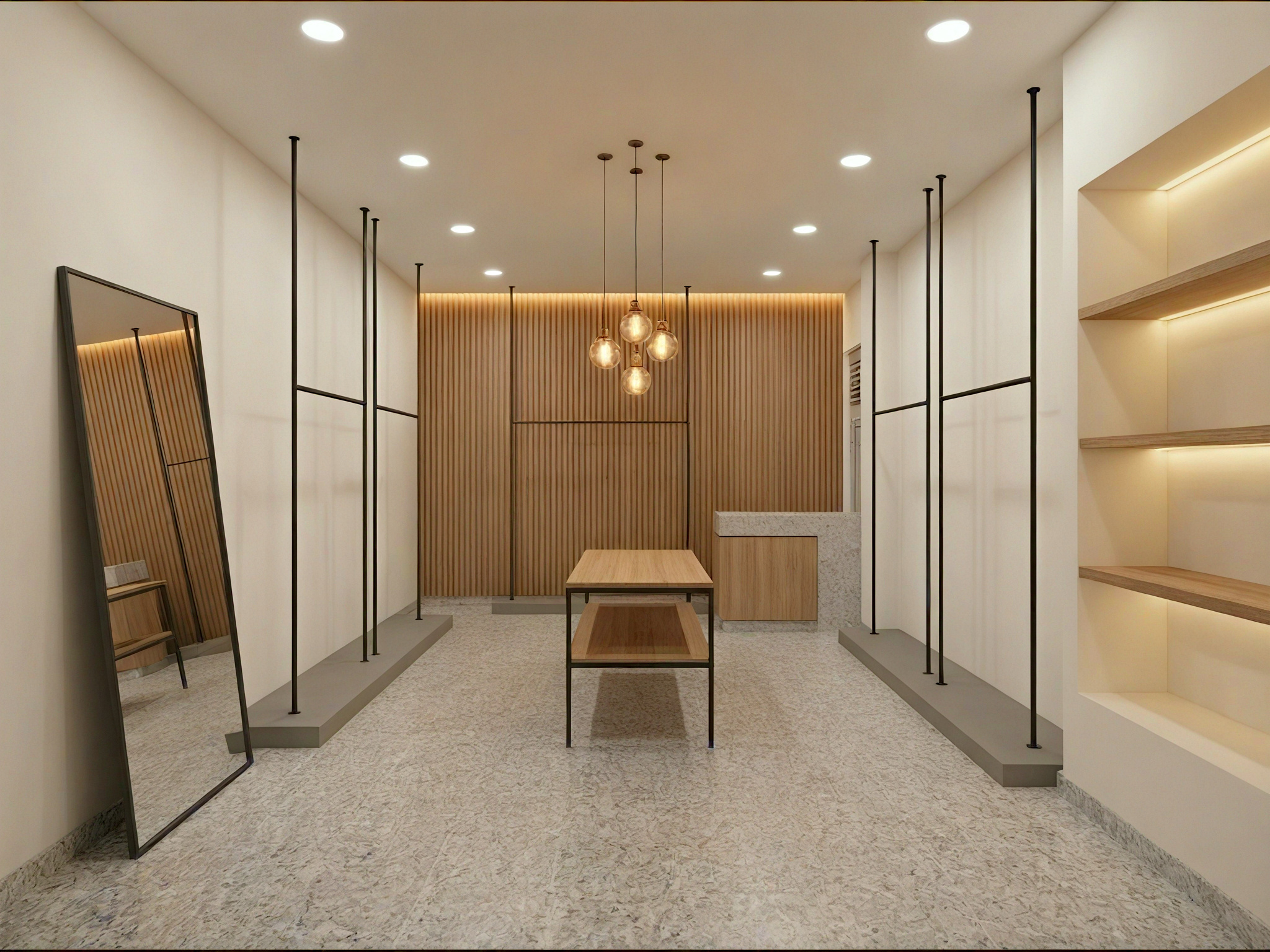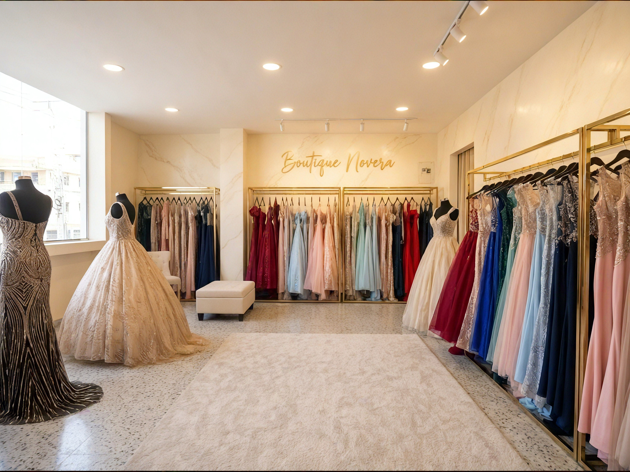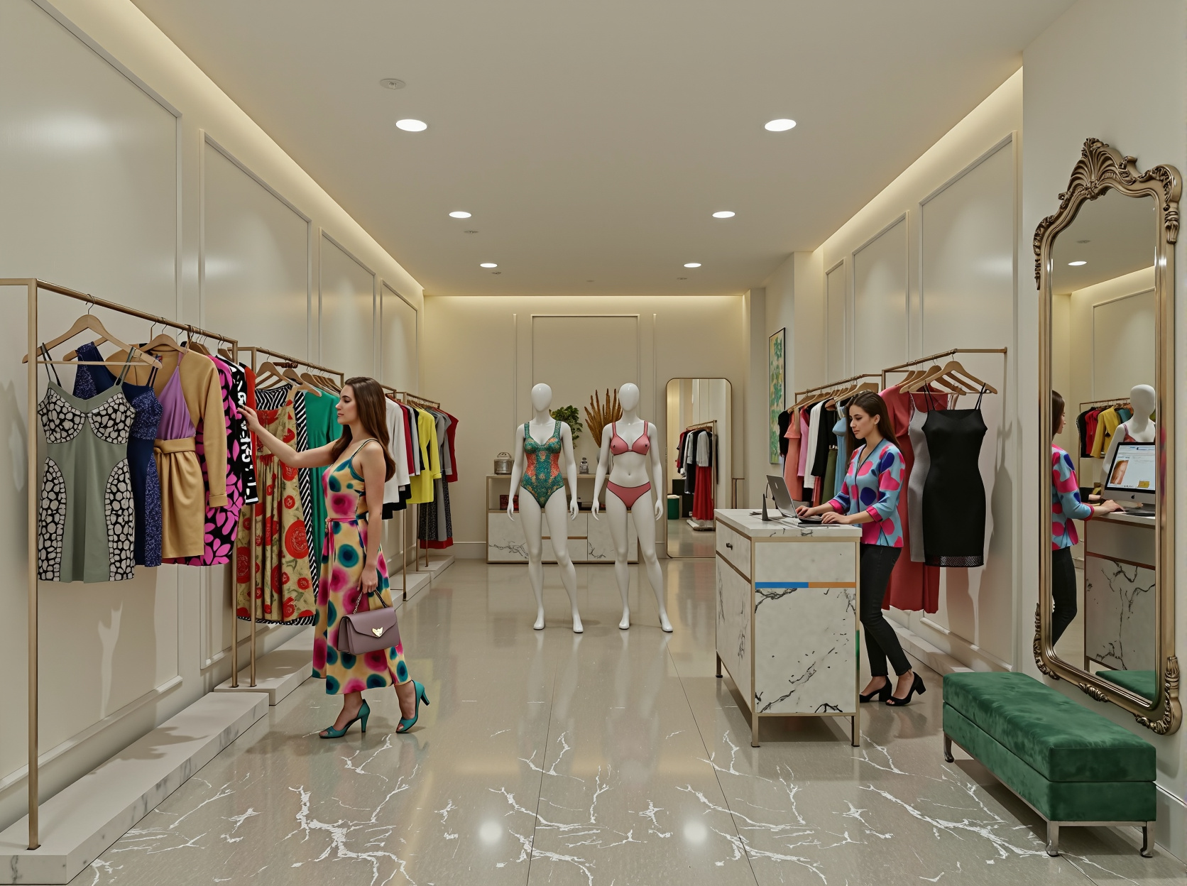 • Boutique spaces include curated racks, display areas, and cash wrap stations